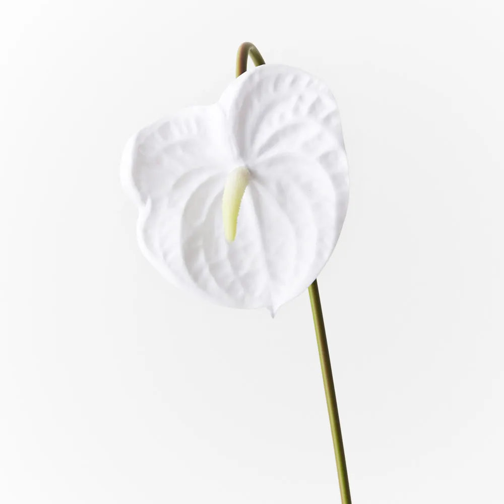 Bring a dash of beauty to your interior space with this gorgeous, real-touch Anthurium in winter white. Easily maintained, this realistic artificial flower stem will bring lasting elegance into your home. Create a one of a kind artificial arrangement mixing with other stems or place in a decorative vase on its own. For longer lasting faux flower stems, keep out of direct sunlight.